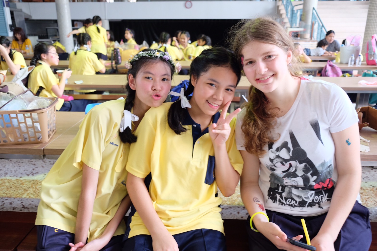So this morning I had to get up early (5:00) because I needed to be at school early in order to read a speech about… shoot what was it called again? Sur- something economy. Oh! Found it- it’s “sufficiency economy”. I didn’t have much of an idea of what this was even after looking over the script, but my host dad explained it to me in the car. Apparently it the idea of an economy where each person grows what they eat, and distributes what they have in a pyramid shape. Firstly, whatever they make/harvest etc. goes to them and their family. If they have surplus, then that goes to their neighbors. If there is surplus even then it goes to the community, and so on and so forth in an ever expanding bubble. My conclusion from this, and the speech’s talk of not buying into excess, is that it is proposing that the people keep Thailand’s resources in Thailand, use Thailand’s resources for Thai’s, and distribute goods and money more throughout Thailand. I have no way of knowing whether or not that is accurate, but it seems like a good guess to me. This system was developed by the king, and I think that the speech thing I did today is a way of promoting it maybe? It turns out I wasn’t actually saying it during the morning assembly, but about 30 minutes before the assembly, as students walked to their classes. Anywho, back to what I was saying before. I was supposed to get up at 5:00. I did, and then I promptly fell back asleep. So I wake up at 5:45, and think: didn’t I already do this? Maybe I’m just remembering yesterday. And then I remember and check my phone for the time. Now last night my host dad said we should leave at six, or maybe 6:15. 6:15 it is! I didn’t have my school stuff together and had planned to do that this morning you see. Luckily for me I actually do very little on Mondays. I still managed to misplace the bag I was embroidering though. I had to bring my apron to sewing class instead and work on it, which was handy because I needed to use said apron in third block. I also misplaced my hairbrush after I picked it up. Turns out I put it in my book bag. What the heck?? My hair stays in braids all day and there is literally no reason why I would have put it in there. Good job sleepy Aria. Anyways I didn’t have it with me for when Bee would do my hair so I did my best with a comb :X . I found out when I got in the car that she had been sleeping until my host dad called for her. Sorry Bee!!! From there we drove to school, traffic bad as per usual [fun fact: Bangkok has the worst traffic in the world. Actually.] I got to school, realised I had no idea where I was supposed to go, saw my friend waving to me from the office and revised then said our speech into the microphone at the office.